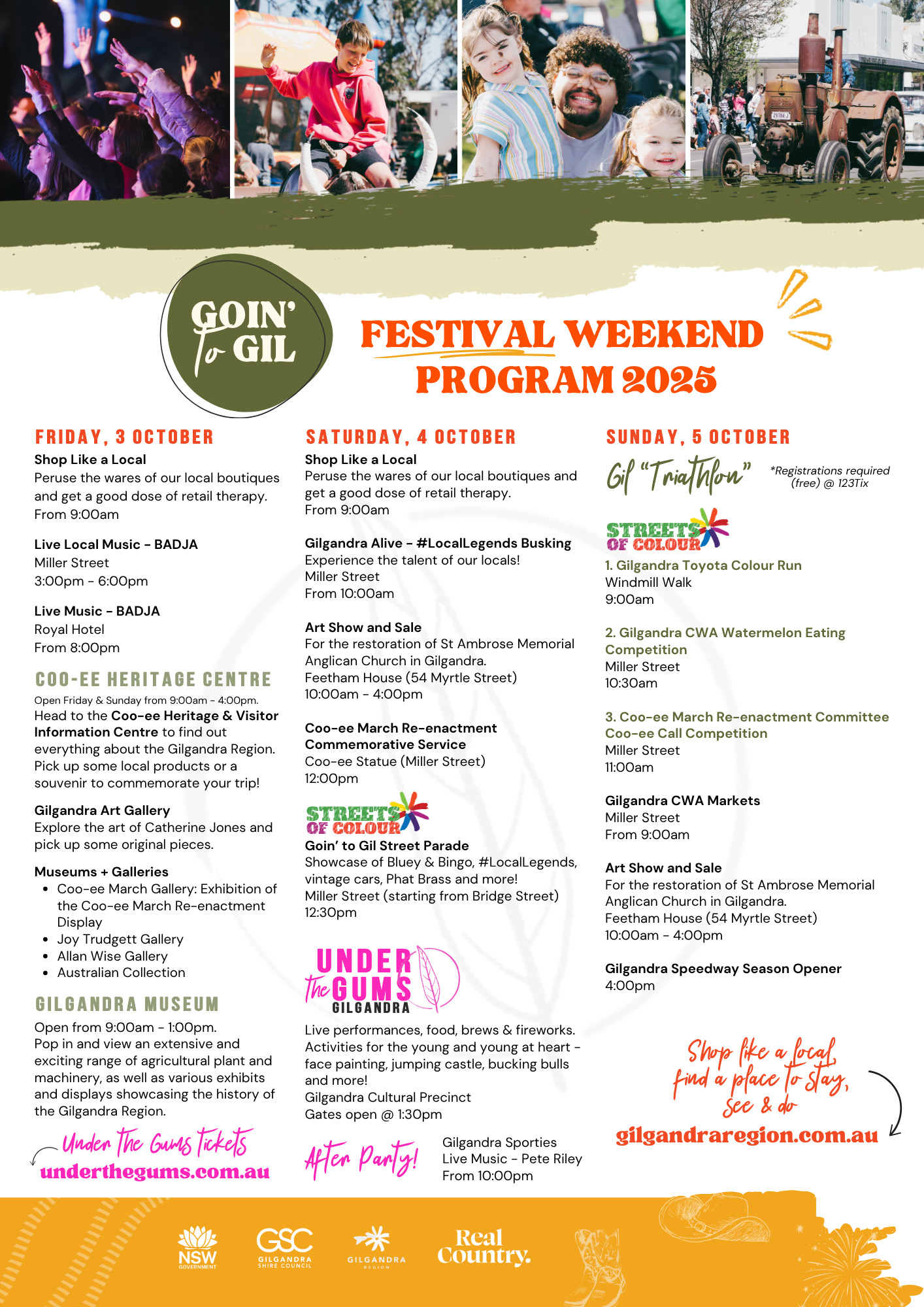 Held 25-27 September 2026, the Goin’ to Gil Festival Weekend is a packed weekend of events, activities and great times! Ranging from activations like #LocalLegends busking to the Gil Triathlon (Colour Run, Watermelon Eating Competition, and Coo-ee Call Competition) to name a few, as well as the 2026 edition of Under the Gums Gilgandra, it all happens in Gilgandra during this weekend! Check out the 2025 Weekend Program Below for an idea of what's on and the fun we have!